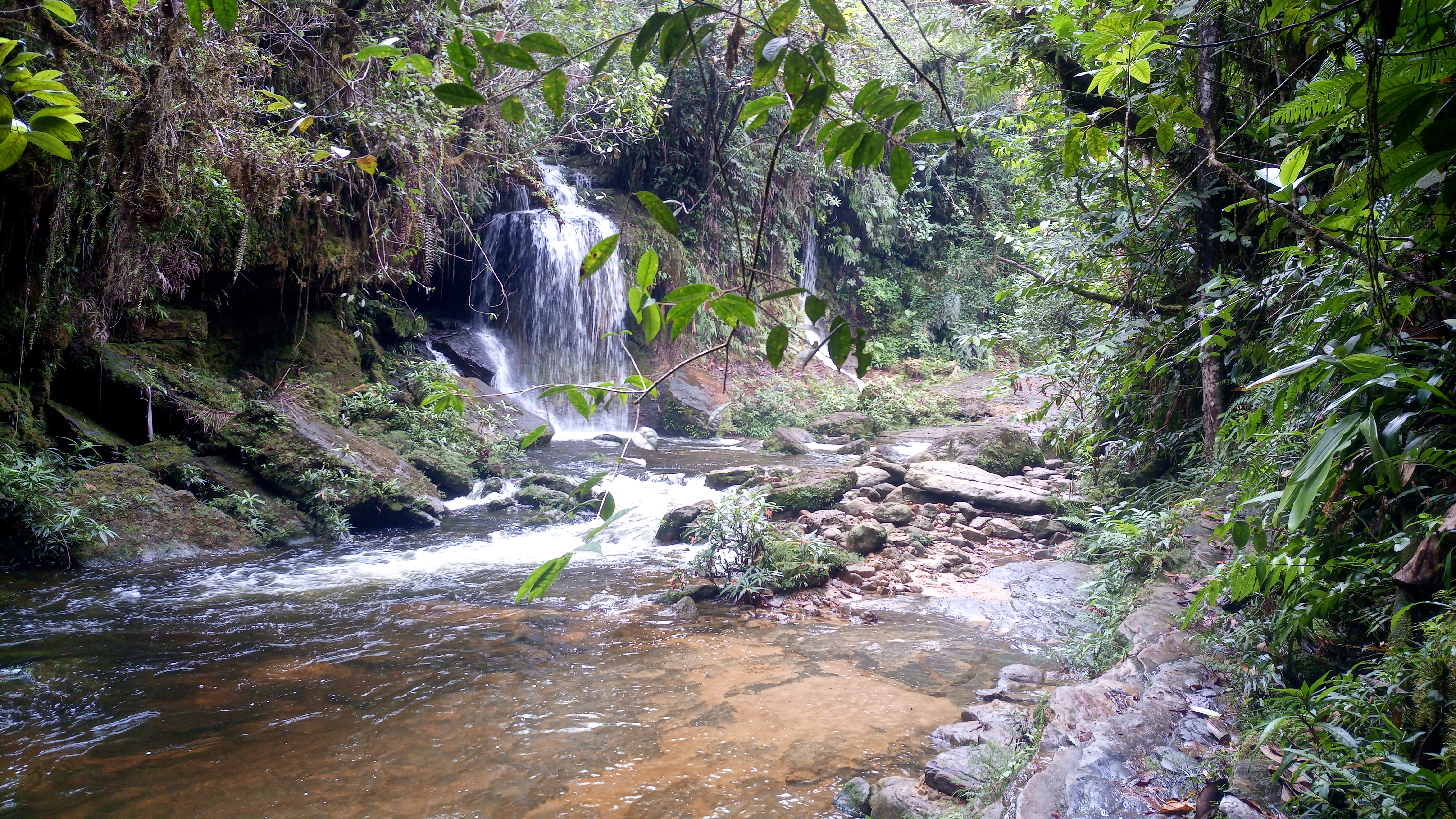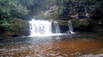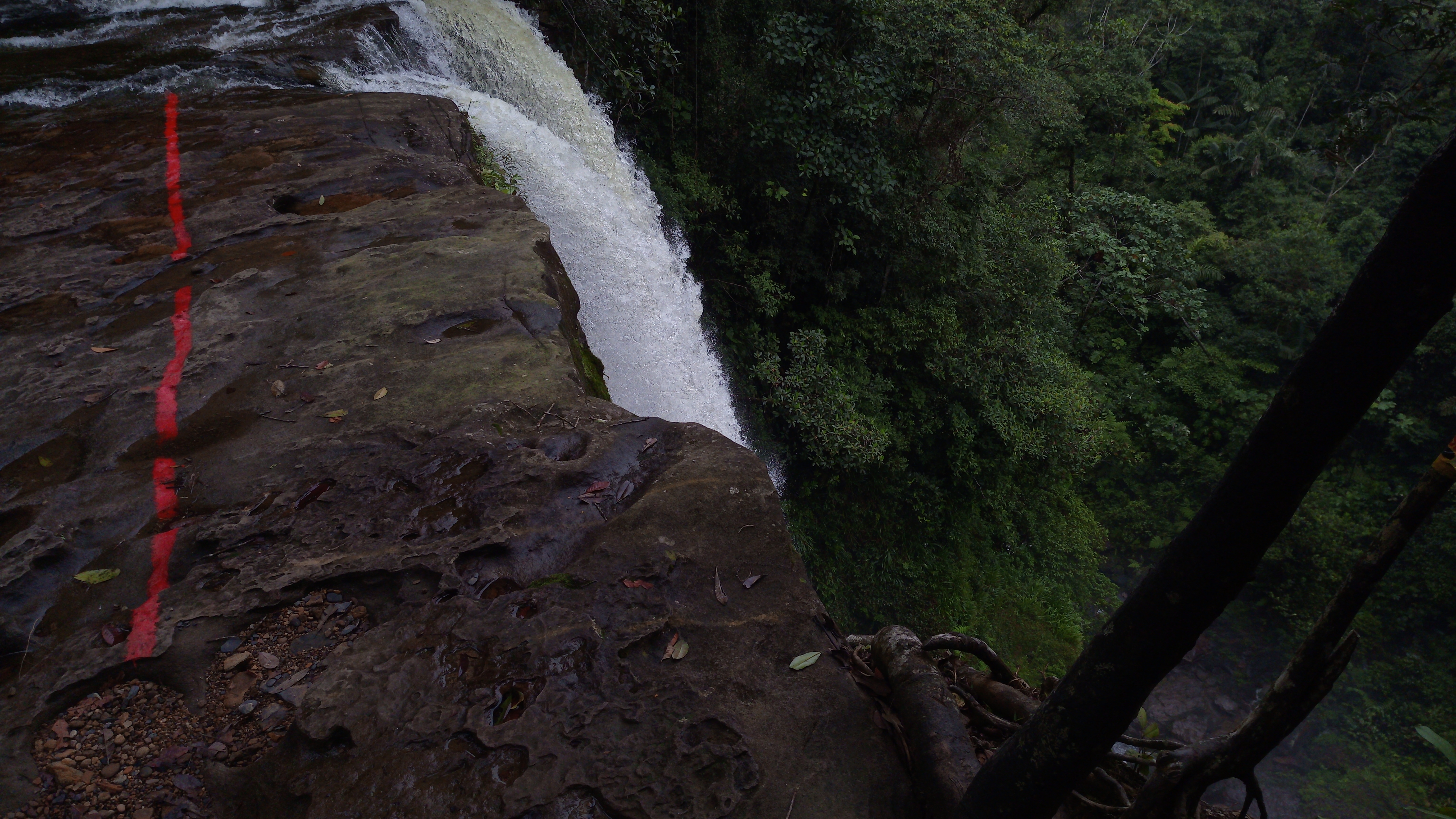 Vom Zeltplatz aus waren es nur wenige Meter bis zum Eingang zum Ende der Welt. Diesen dramatischen Namen (Fin del Mundo) trägt ein Wasserfall, zu dem man in ca. zwei Stunden durch Regenwald wandern kann. Bei gutem Wetter lohnte sich der Weg: Nachdem wir kriechend einen Blick über den Wasserfallrand geworfen hatten, badete ich noch ausführlich in dem Fluss, der sich über viele kleinere Wasserfälle durch den Wald schlängelte. Ein plötzlicher Regenguss spülte uns dann auch schon wieder aus dem Park heraus.