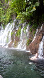 Beim Baden im warmen Meer ließen wir uns von den Wellen durchschütteln und bei meiner ersten Surfstunde lernte ich immerhin, das Surfbrett auszubalancieren, zu paddeln und darauf zu sitzen. Außerdem konnte ich bei meinem Surflehrer beobachten, wie der Kontakt mit einer Portugiesischen Galeere abläuft und dass das eine Erfahrung ist, auf die ich gerne verzichte. Ich lernte, dass Surfen schwieriger ist, als es aussieht und hohe Wellen an einem Felsenstrand für einen Barney (Surfersprache für „Anfänger“) wie mich eigentlich etwas zu gefährlich sind. Trotzdem schaffte ich es am Ende irgendwie unverletzt zum Strand.